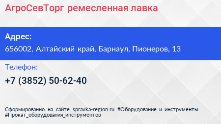 АгроСевТорг, ремесленная лавка по адресу 656002, Алтайский край, Барнаул, Пионеров, 13 в дальнейшем Организация, размещена в следующих категориях: