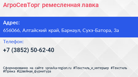 АгроСевТорг, ремесленная лавка по адресу 656066, Алтайский край, Барнаул, Сухэ-Батора, 3а в дальнейшем Организация, размещена в следующих категориях: