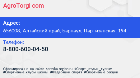 AgroTorgi.com по адресу 656008, Алтайский край, Барнаул, Партизанская, 194 в дальнейшем Организация, размещена в следующих категориях: