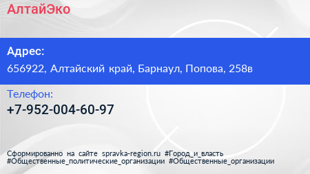 АлтайЭко по адресу 656922, Алтайский край, Барнаул, Попова, 258в в дальнейшем Организация, размещена в следующих категориях: