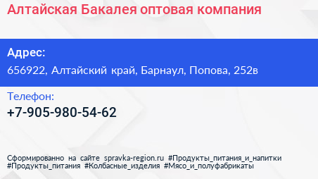 Алтайская Бакалея, оптовая компания по адресу 656922, Алтайский край, Барнаул, Попова, 252в в дальнейшем Организация, размещена в следующих категориях: