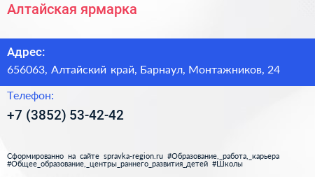 Алтайская ярмарка по адресу 656063, Алтайский край, Барнаул, Монтажников, 24 в дальнейшем Организация, размещена в следующих категориях: