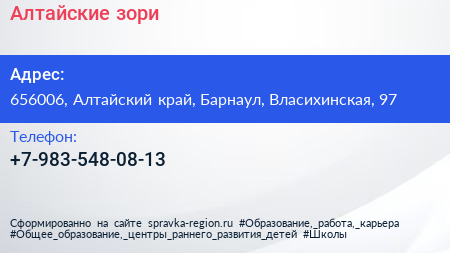 Алтайские зори по адресу 656006, Алтайский край, Барнаул, Власихинская, 97 в дальнейшем Организация, размещена в следующих категориях: