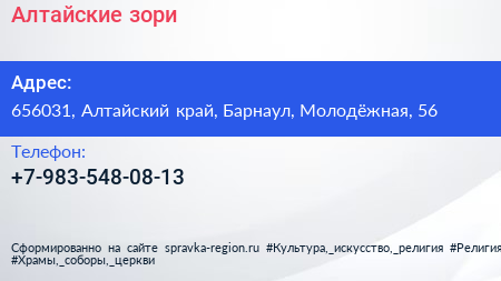 Алтайские зори по адресу 656031, Алтайский край, Барнаул, Молодёжная, 56 в дальнейшем Организация, размещена в следующих категориях: