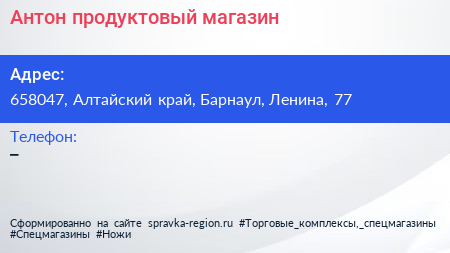 Антон, продуктовый магазин по адресу 658047, Алтайский край, Барнаул, Ленина, 77 в дальнейшем Организация, размещена в следующих категориях: