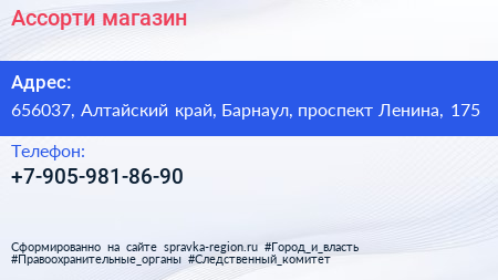 Ассорти, магазин по адресу 656037, Алтайский край, Барнаул, проспект Ленина, 175 в дальнейшем Организация, размещена в следующих категориях:
