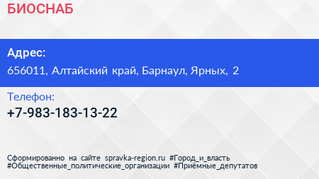 БИОСНАБ по адресу 656011, Алтайский край, Барнаул, Ярных, 2 в дальнейшем Организация, размещена в следующих категориях: