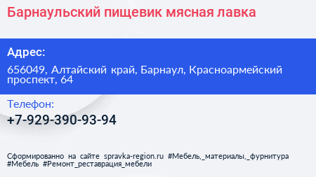 Барнаульский пищевик, мясная лавка по адресу 656049, Алтайский край, Барнаул, Красноармейский проспект, 64 в дальнейшем Организация, размещена в следующих категориях: