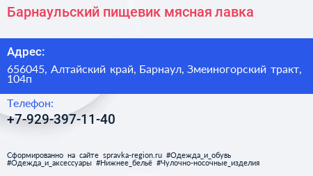 Барнаульский пищевик, мясная лавка по адресу 656045, Алтайский край, Барнаул, Змеиногорский тракт, 104п в дальнейшем Организация, размещена в следующих категориях: