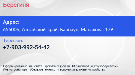 Берегиня по адресу 656006, Алтайский край, Барнаул, Малахова, 179 в дальнейшем Организация, размещена в следующих категориях:
