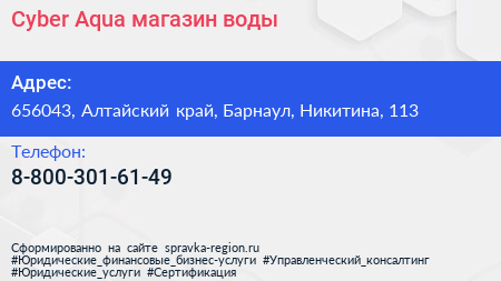 Cyber Aqua, магазин воды по адресу 656043, Алтайский край, Барнаул, Никитина, 113 в дальнейшем Организация, размещена в следующих категориях:
