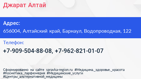 Джарат Алтай по адресу 656004, Алтайский край, Барнаул, Водопроводная, 122 в дальнейшем Организация, размещена в следующих категориях: