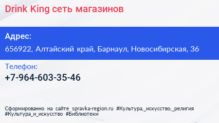 Drink King, сеть магазинов по адресу 656922, Алтайский край, Барнаул, Новосибирская, 36 в дальнейшем Организация, размещена в следующих категориях: