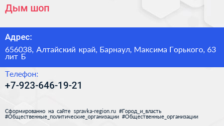 Дым шоп по адресу 656038, Алтайский край, Барнаул, Максима Горького, 63 лит Б в дальнейшем Организация, размещена в следующих категориях: