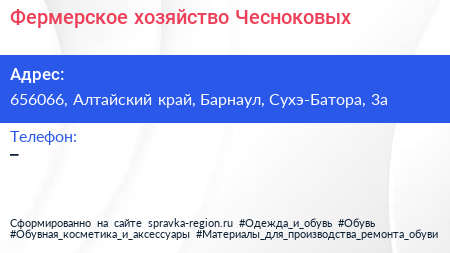 Фермерское хозяйство Чесноковых по адресу 656066, Алтайский край, Барнаул, Сухэ-Батора, 3а в дальнейшем Организация, размещена в следующих категориях: