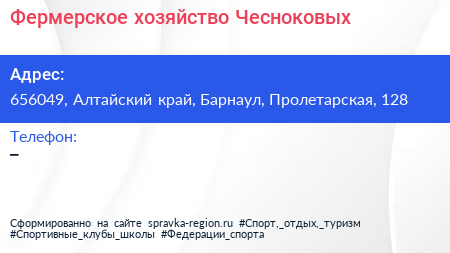Фермерское хозяйство Чесноковых по адресу 656049, Алтайский край, Барнаул, Пролетарская, 128 в дальнейшем Организация, размещена в следующих категориях: