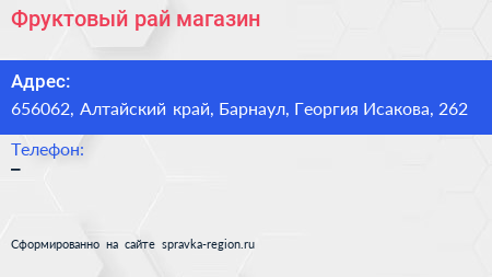 Фруктовый рай, магазин по адресу 656062, Алтайский край, Барнаул, Георгия Исакова, 262 в дальнейшем Организация, размещена в следующих категориях: