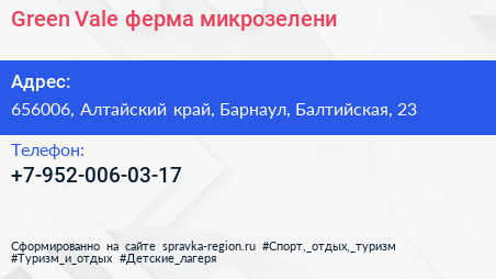 Green Vale, ферма микрозелени по адресу 656006, Алтайский край, Барнаул, Балтийская, 23 в дальнейшем Организация, размещена в следующих категориях:
