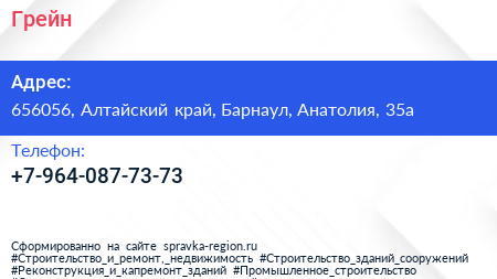 Грейн по адресу 656056, Алтайский край, Барнаул, Анатолия, 35а в дальнейшем Организация, размещена в следующих категориях: