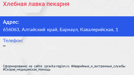 Хлебная лавка, пекарня по адресу 656063, Алтайский край, Барнаул, Кавалерийская, 1 в дальнейшем Организация, размещена в следующих категориях: