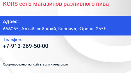 KORS, сеть магазинов разливного пива по адресу 656055, Алтайский край, Барнаул, Юрина, 265Б в дальнейшем Организация, размещена в следующих категориях: