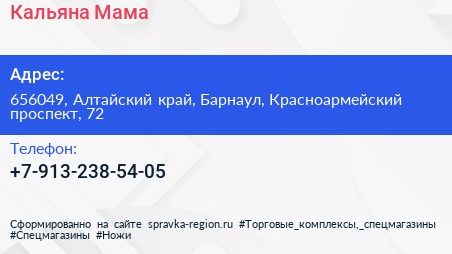Кальяна Мама по адресу 656049, Алтайский край, Барнаул, Красноармейский проспект, 72 в дальнейшем Организация, размещена в следующих категориях: