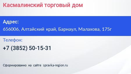 Касмалинский, торговый дом по адресу 656006, Алтайский край, Барнаул, Малахова, 175г в дальнейшем Организация, размещена в следующих категориях: