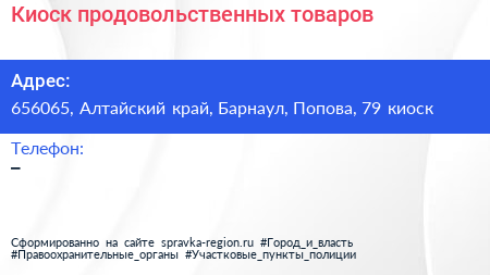 Киоск продовольственных товаров по адресу 656065, Алтайский край, Барнаул, Попова, 79 киоск в дальнейшем Организация, размещена в следующих категориях: