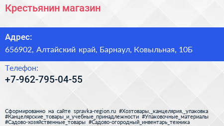 Крестьянин, магазин по адресу 656902, Алтайский край, Барнаул, Ковыльная, 10Б в дальнейшем Организация, размещена в следующих категориях:
