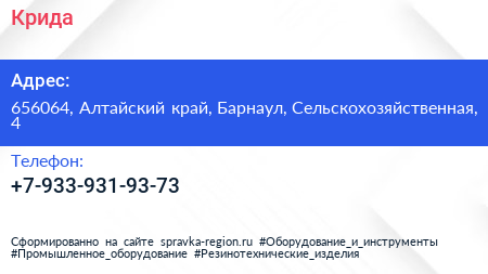Крида по адресу 656064, Алтайский край, Барнаул, Сельскохозяйственная, 4 в дальнейшем Организация, размещена в следующих категориях: