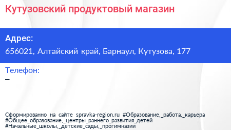 Кутузовский, продуктовый магазин по адресу 656021, Алтайский край, Барнаул, Кутузова, 177 в дальнейшем Организация, размещена в следующих категориях: