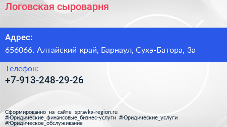 Логовская сыроварня по адресу 656066, Алтайский край, Барнаул, Сухэ-Батора, 3а в дальнейшем Организация, размещена в следующих категориях: