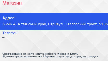 Магазин по адресу 656064, Алтайский край, Барнаул, Павловский тракт, 51 к2 в дальнейшем Организация, размещена в следующих категориях: