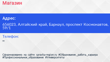 Магазин по адресу 656023, Алтайский край, Барнаул, проспект Космонавтов, 59/1 в дальнейшем Организация, размещена в следующих категориях: