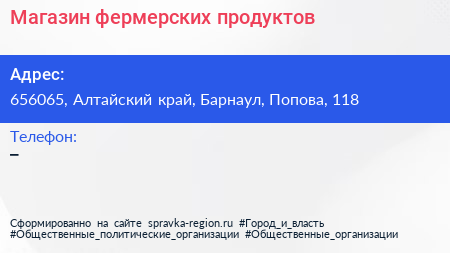 Магазин фермерских продуктов по адресу 656065, Алтайский край, Барнаул, Попова, 118 в дальнейшем Организация, размещена в следующих категориях: