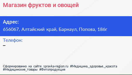 Магазин фруктов и овощей по адресу 656067, Алтайский край, Барнаул, Попова, 186г в дальнейшем Организация, размещена в следующих категориях: