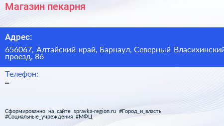 Магазин-пекарня по адресу 656067, Алтайский край, Барнаул, Северный Власихинский проезд, 86 в дальнейшем Организация, размещена в следующих категориях: