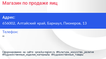 Магазин по продаже яиц по адресу 656002, Алтайский край, Барнаул, Пионеров, 13 в дальнейшем Организация, размещена в следующих категориях: