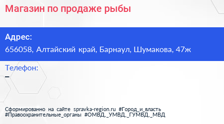 Магазин по продаже рыбы по адресу 656058, Алтайский край, Барнаул, Шумакова, 47ж в дальнейшем Организация, размещена в следующих категориях: