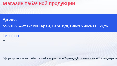 Магазин табачной продукции по адресу 656006, Алтайский край, Барнаул, Власихинская, 59/ж в дальнейшем Организация, размещена в следующих категориях: