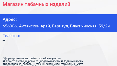 Магазин табачных изделий по адресу 656006, Алтайский край, Барнаул, Власихинская, 59/2и в дальнейшем Организация, размещена в следующих категориях: