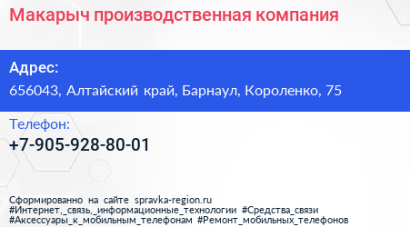 Макарыч, производственная компания по адресу 656043, Алтайский край, Барнаул, Короленко, 75 в дальнейшем Организация, размещена в следующих категориях: