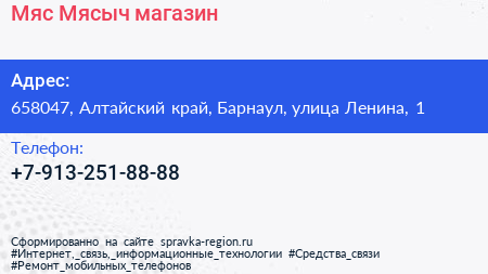 Мяс Мясыч, магазин по адресу 658047, Алтайский край, Барнаул, улица Ленина, 1 в дальнейшем Организация, размещена в следующих категориях: