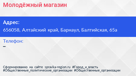 Молодёжный, магазин по адресу 656058, Алтайский край, Барнаул, Балтийская, 65а в дальнейшем Организация, размещена в следующих категориях: