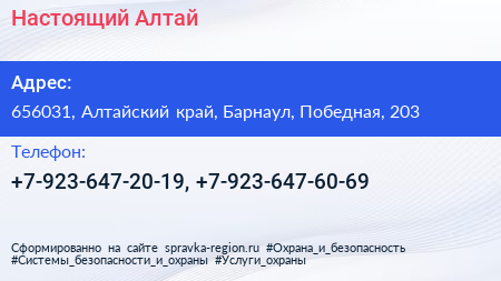 Настоящий Алтай по адресу 656031, Алтайский край, Барнаул, Победная, 203 в дальнейшем Организация, размещена в следующих категориях: