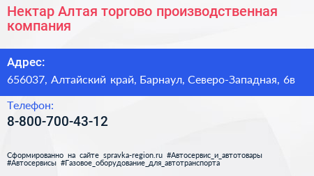 Нектар Алтая, торгово-производственная компания по адресу 656037, Алтайский край, Барнаул, Северо-Западная, 6в в дальнейшем Организация, размещена в следующих категориях: