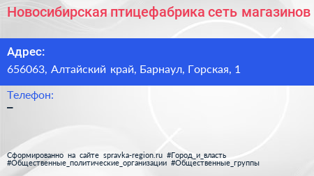 Новосибирская птицефабрика, сеть магазинов по адресу 656063, Алтайский край, Барнаул, Горская, 1 в дальнейшем Организация, размещена в следующих категориях: