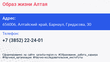 Образ жизни Алтая по адресу 656006, Алтайский край, Барнаул, Гридасова, 30 в дальнейшем Организация, размещена в следующих категориях: