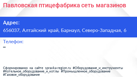 Павловская птицефабрика, сеть магазинов по адресу 656037, Алтайский край, Барнаул, Северо-Западная, 6 в дальнейшем Организация, размещена в следующих категориях:
