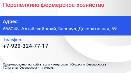 Перепёлкино, фермерское хозяйство по адресу 656048, Алтайский край, Барнаул, Декоративная, 59 в дальнейшем Организация, размещена в следующих категориях: